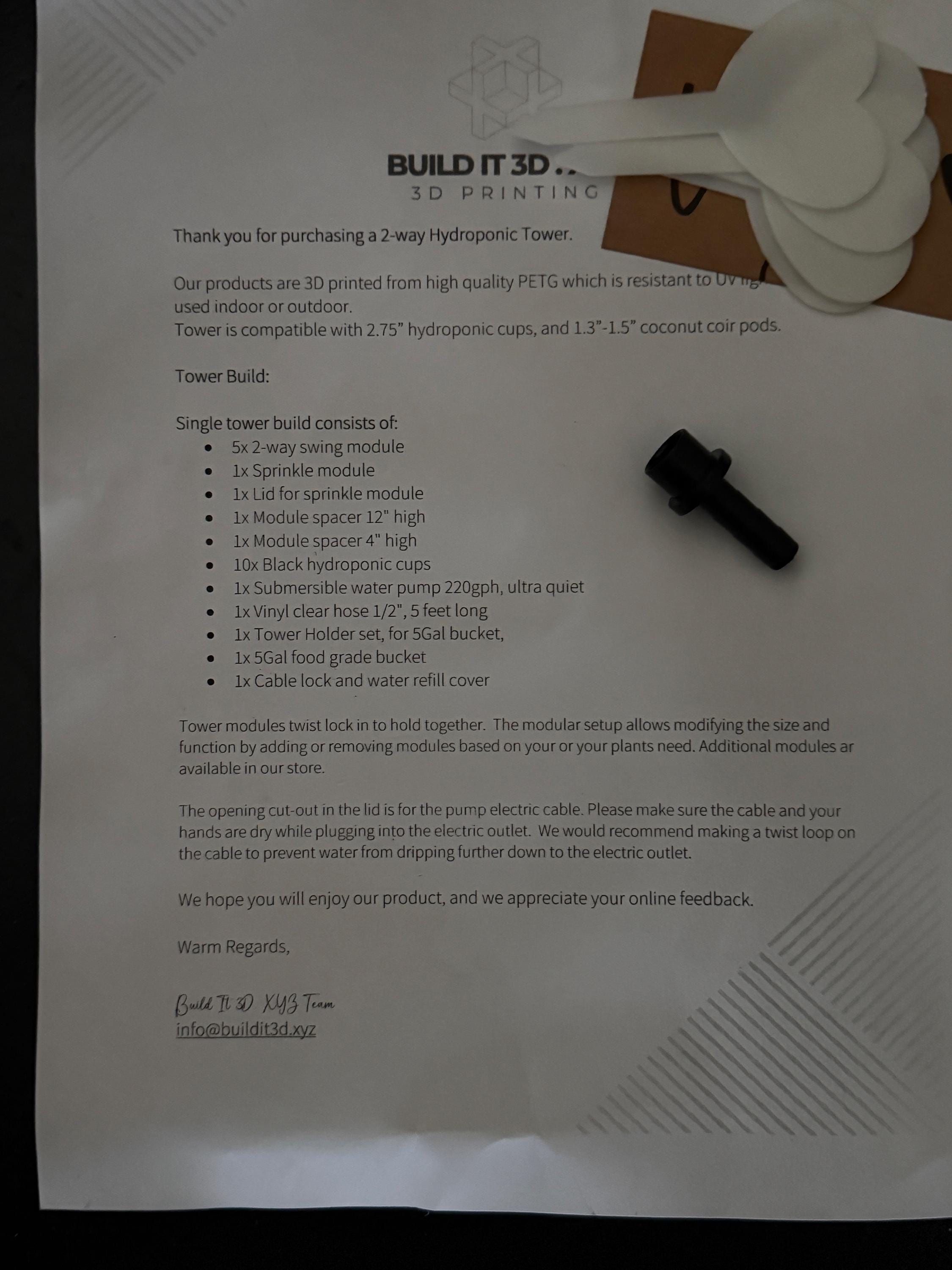 The components seem very good quality. Product was shipped in a recycled unusually shaped box with one side that was not flat. Everything appears to be damaged free. Although odd, I am not complaining. There was a list of parts sent with the order. Perhaps a few extra items sent versus what’s on that list (see photos). Customer service was OK. If you are new to hydroponic note that there were no assembly instructions nor photos nor helpful assembly or Use tips. A couple more photos on the shop site would be appreciated.