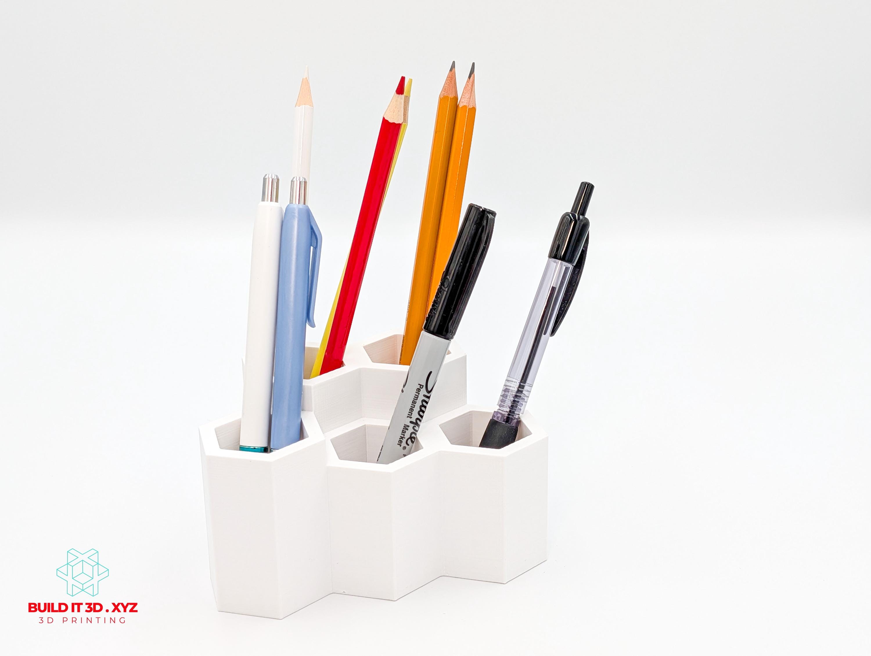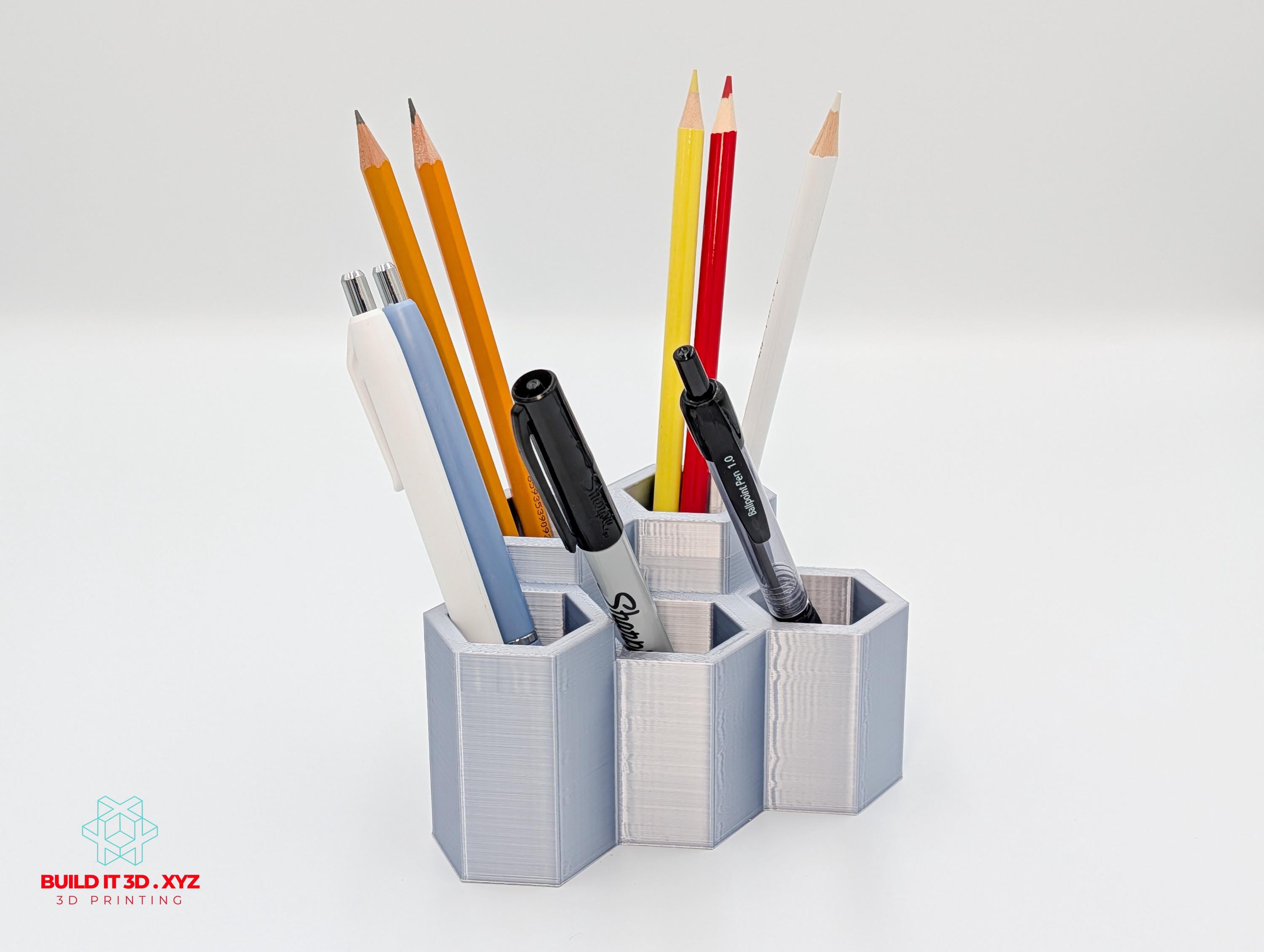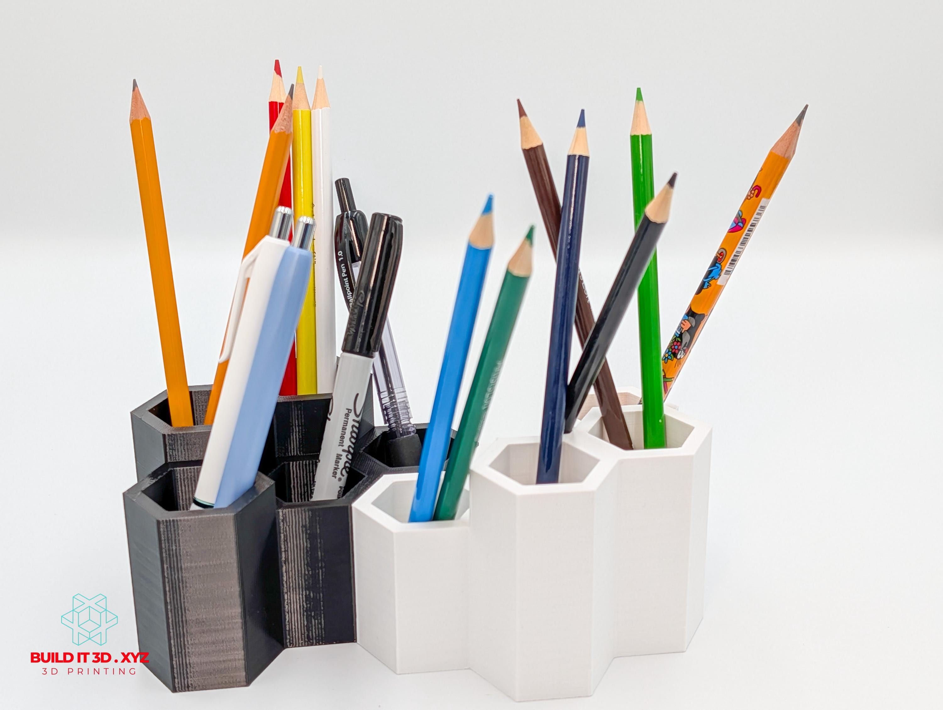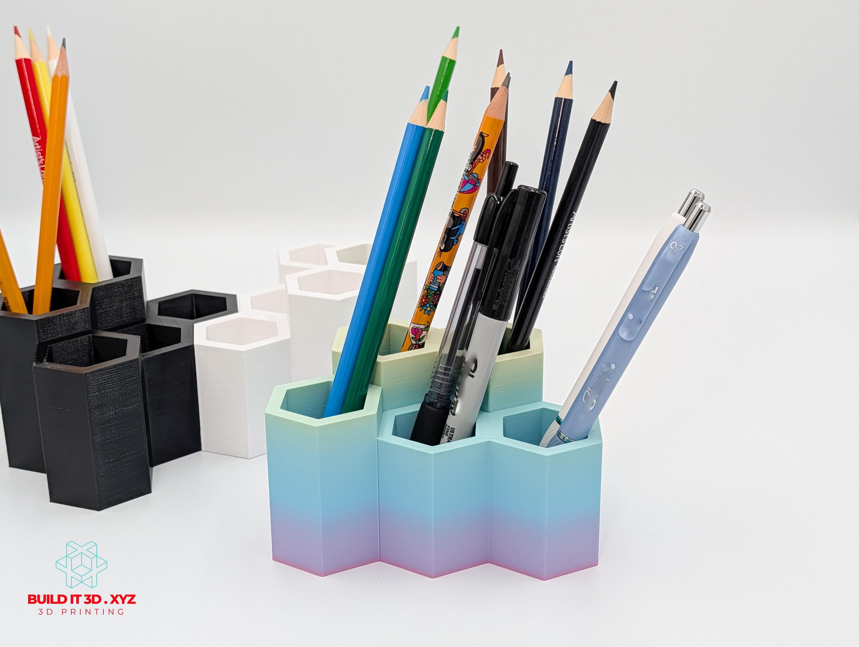 Honeycomb shaped pencil and pen desk organizer. Various color options allow to pick the right choice. The organizer is shaped the way that allows many pieces to be alligned next to each other if you need to expand the storage.