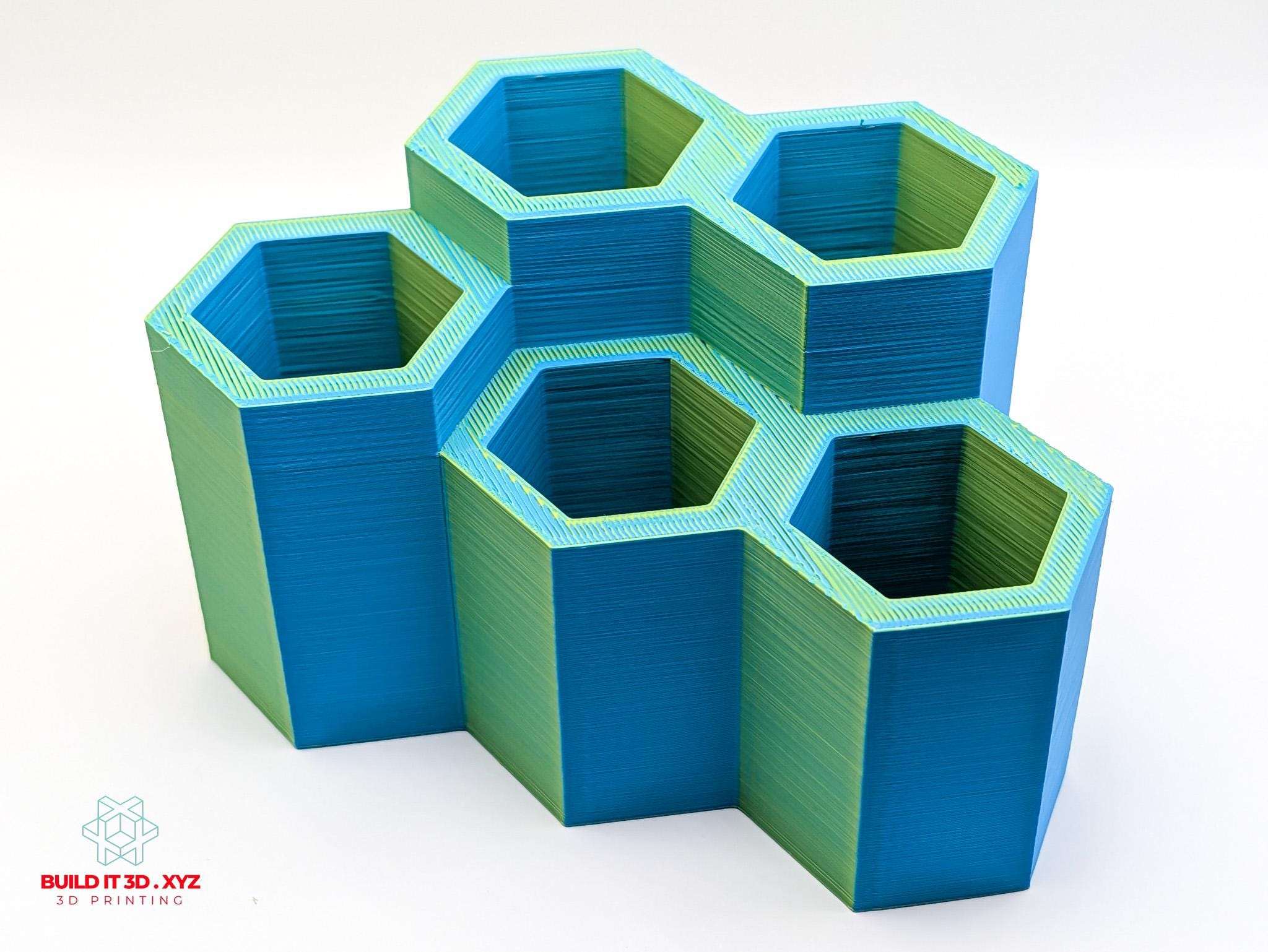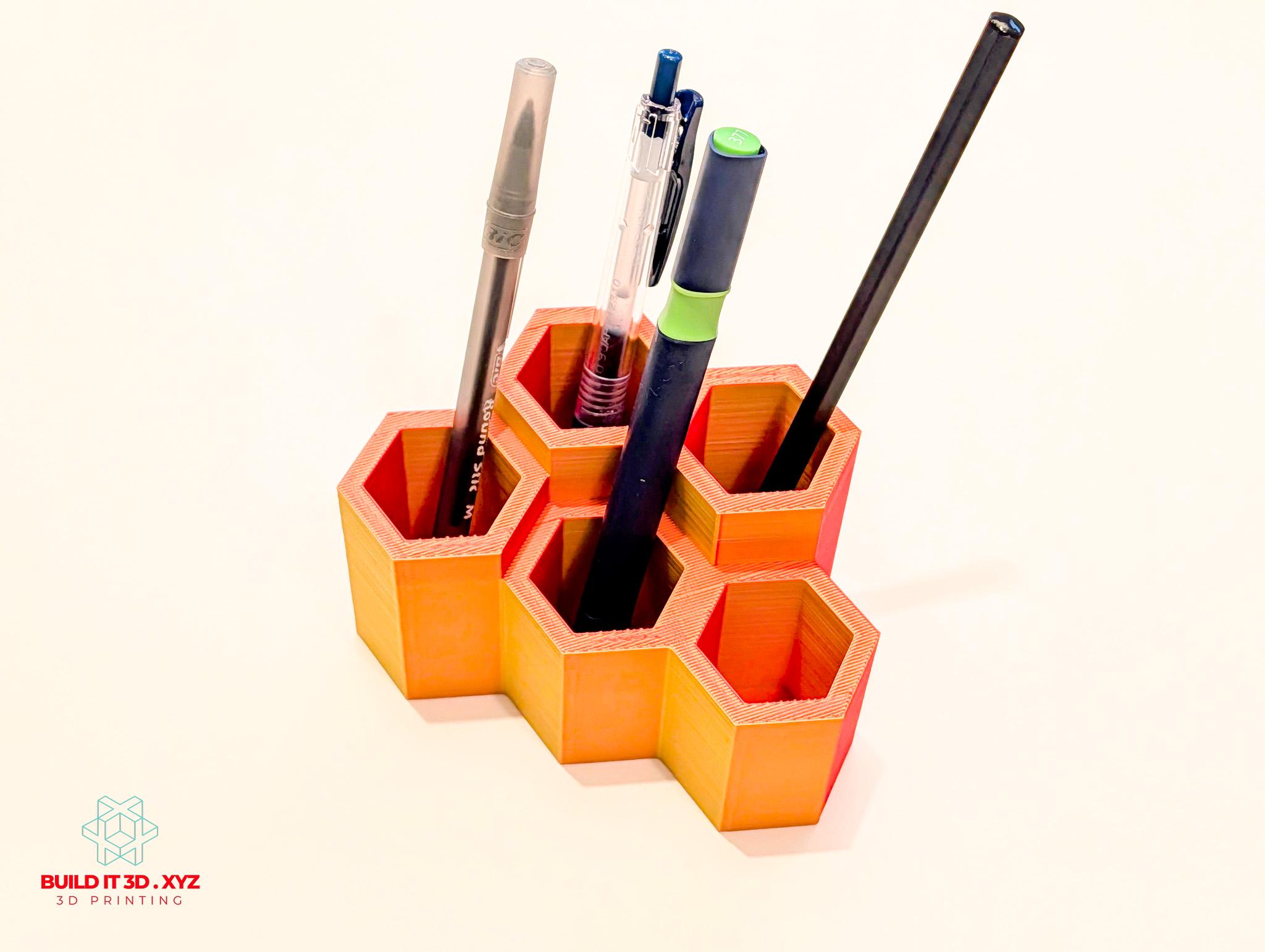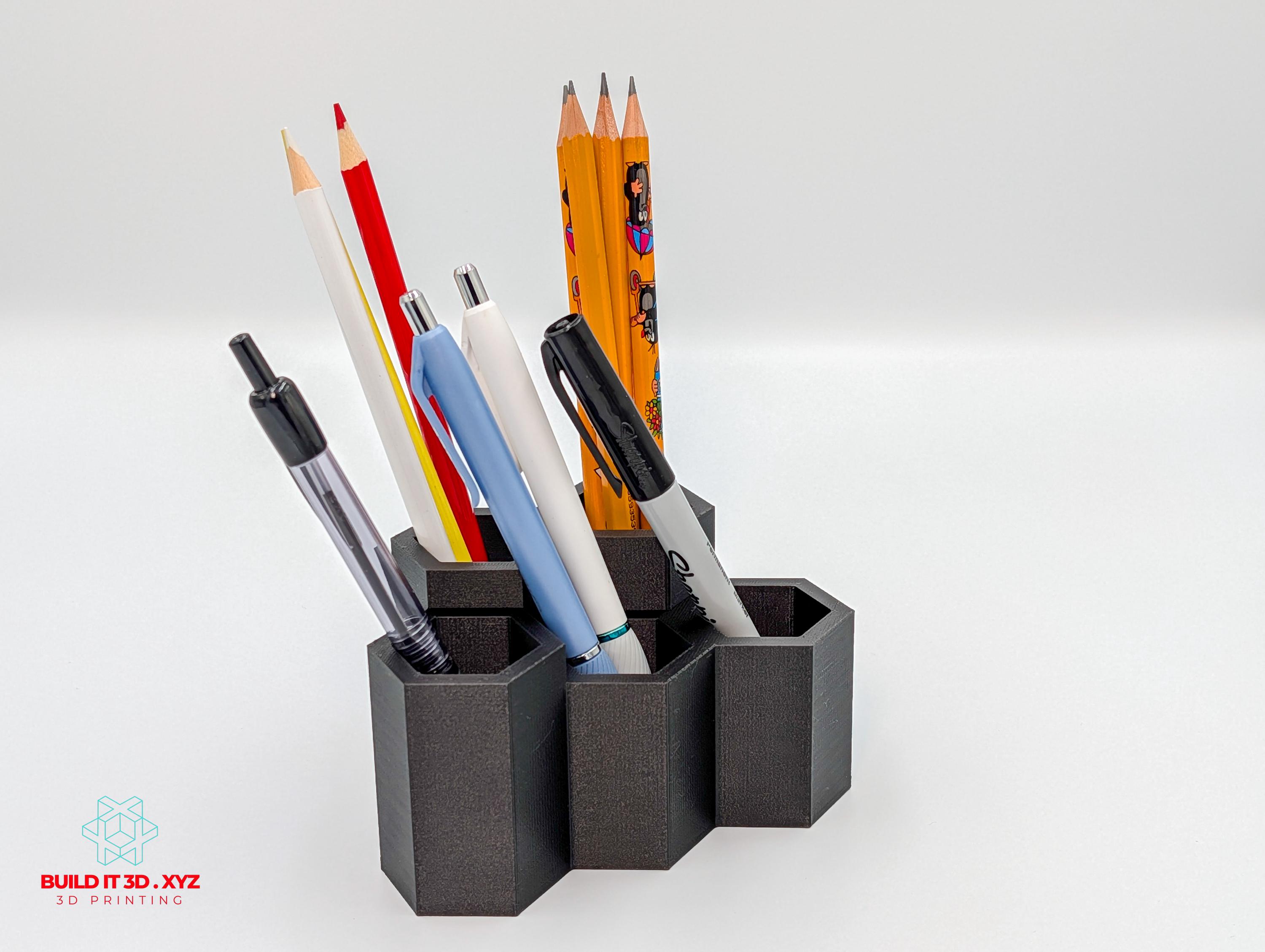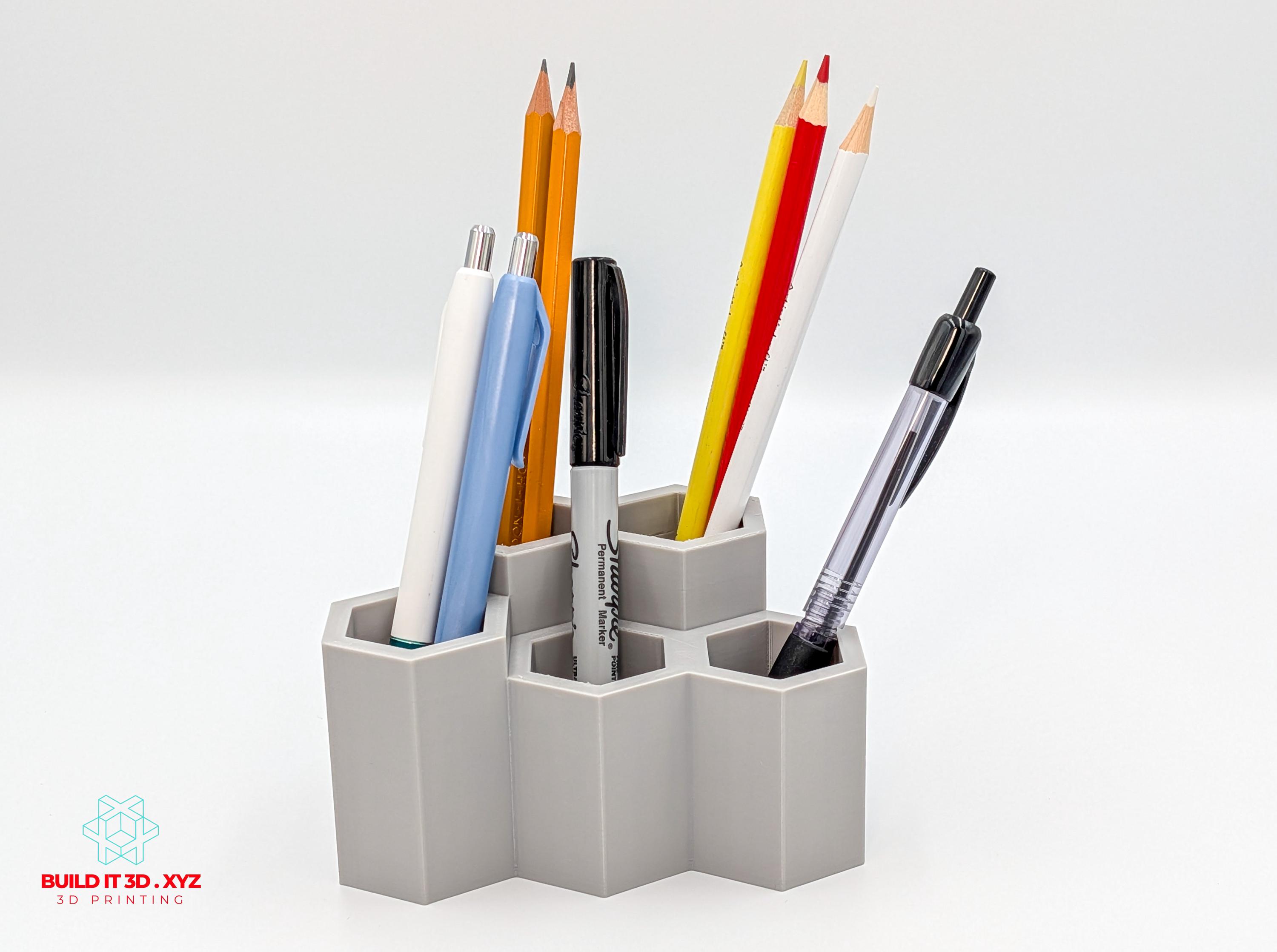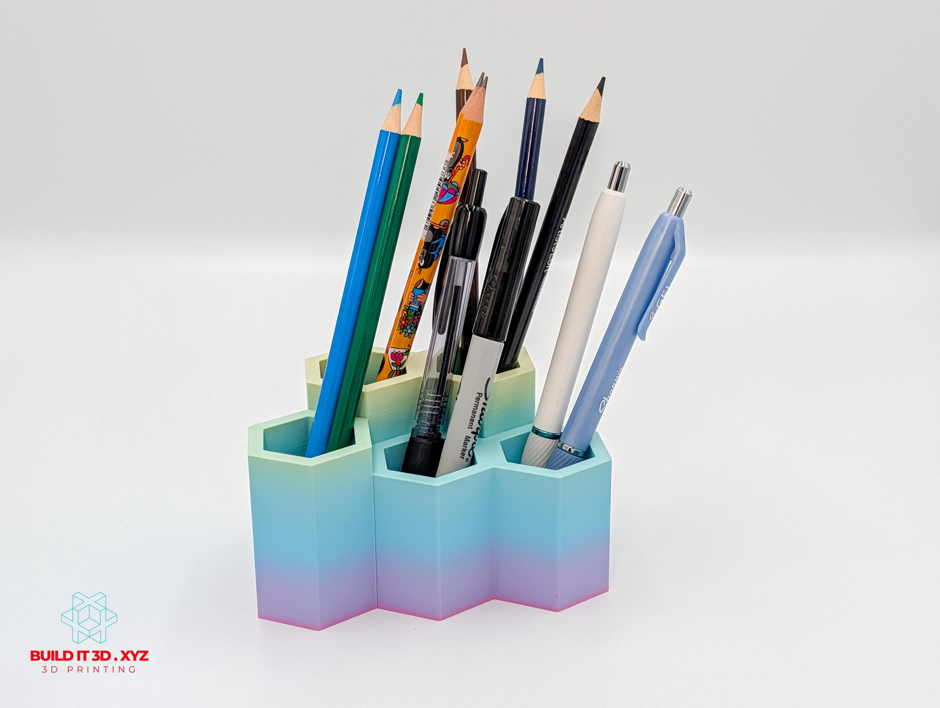 Honeycomb shaped pencil and pen desk organizer. Various color options allow to pick the right choice. The organizer is shaped the way that allows many pieces to be alligned next to each other if you need to expand the storage.