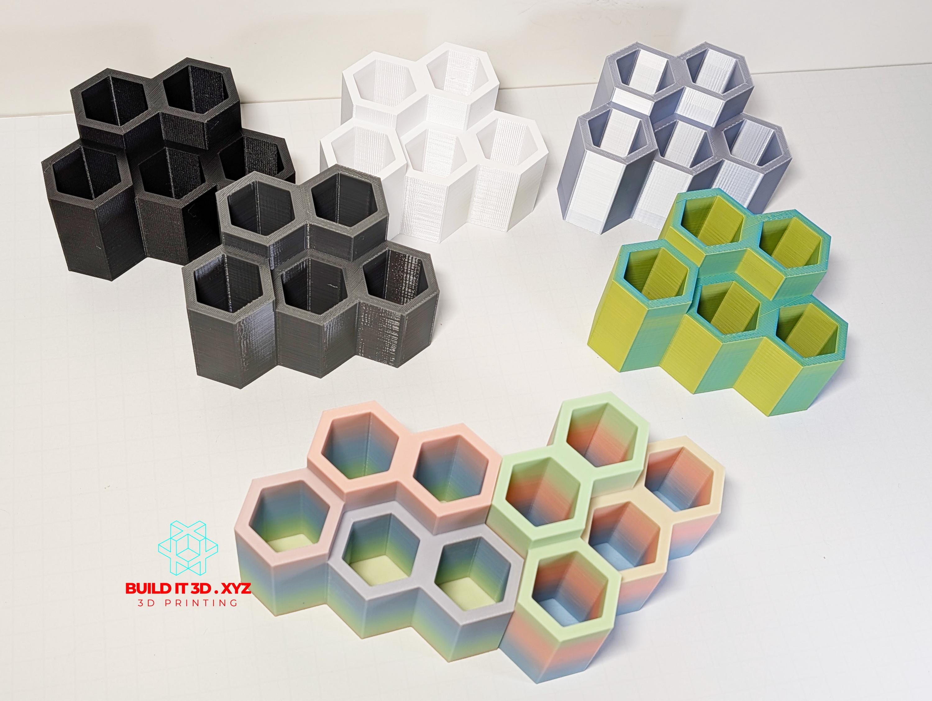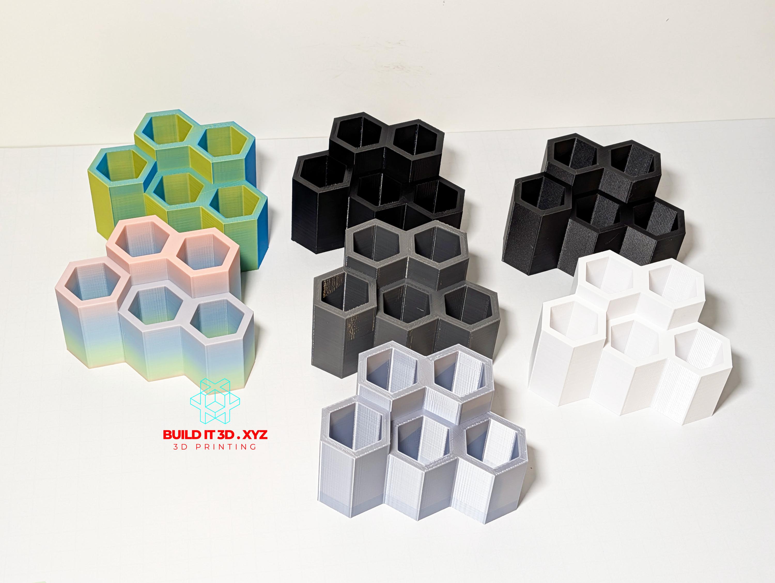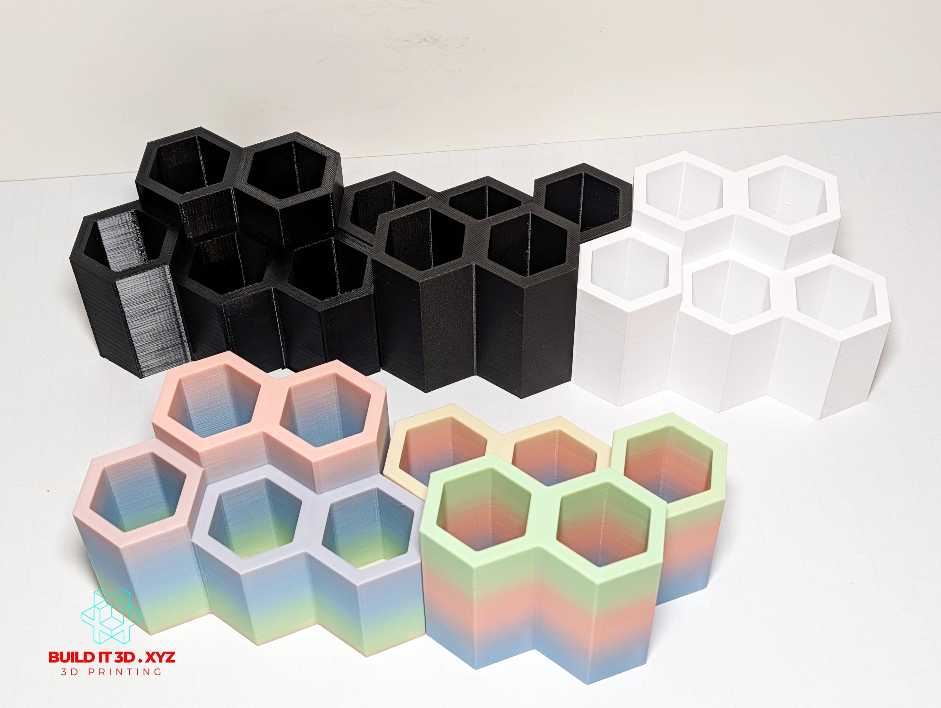 Honeycomb shaped pencil and pen desk holder. Various color options allow to pick the right choice. The holders are shaped the way that allows them to be alligned next to each other if you need to keep more pencil or pens available. Made our of PLA or PETG. Measurments: 120x80x70mm or 4.7"x3.14x2.75 Color options and materials: Rainbow - PLA Green/Blue - PLA Orange/Red - PLA Silver - PLA Gray - PETG Black - PETG Black Carbon - Carbon PETG White - PETG