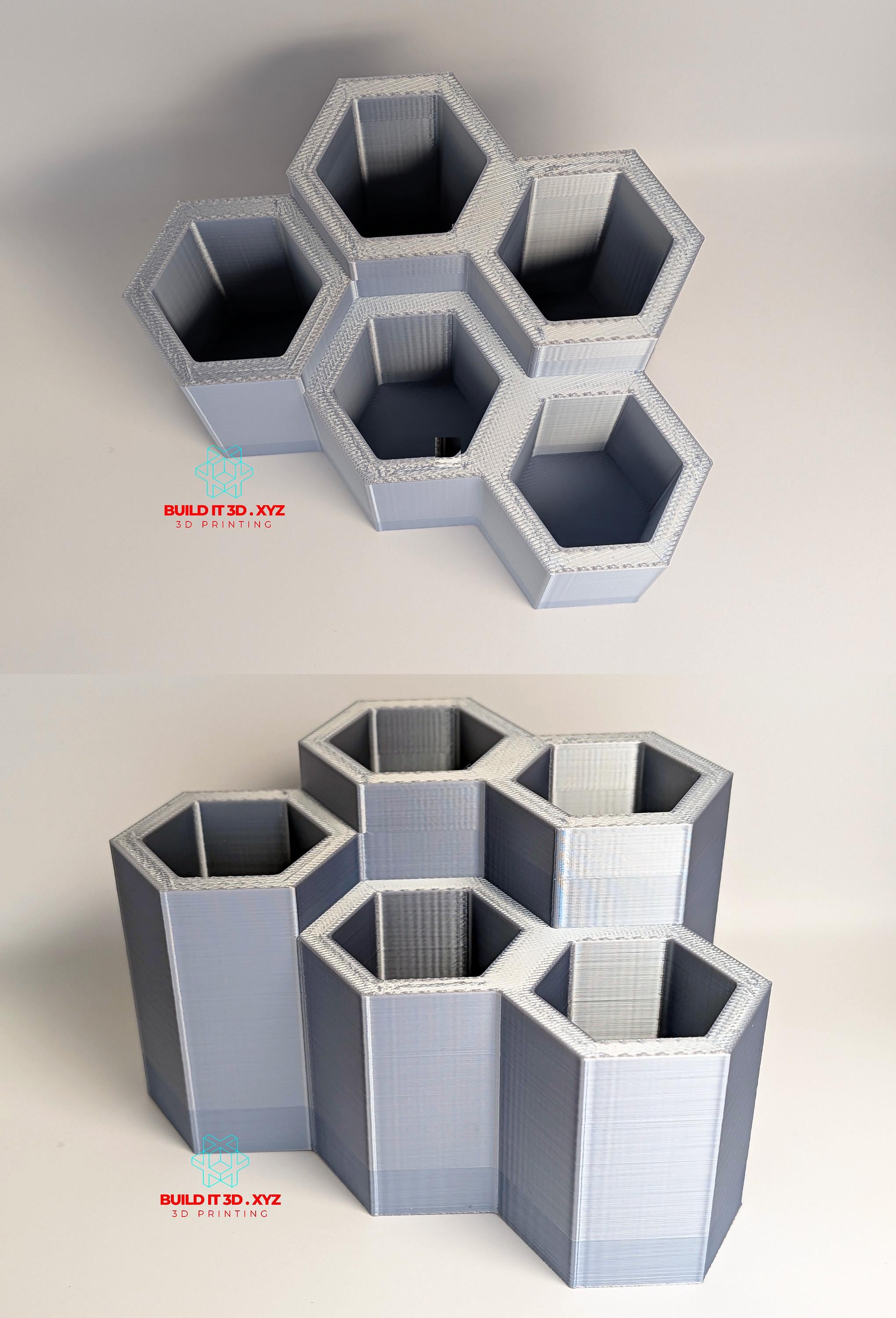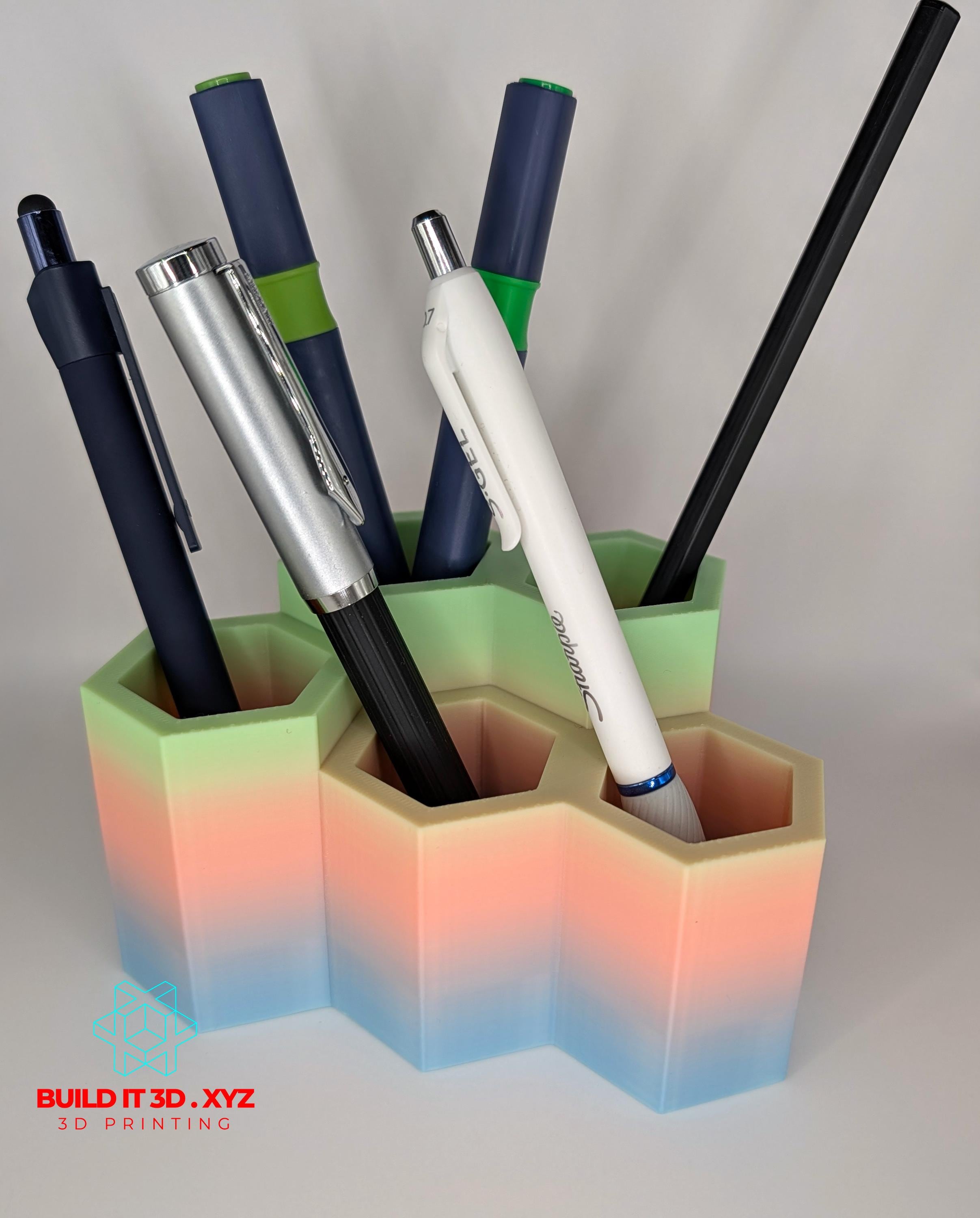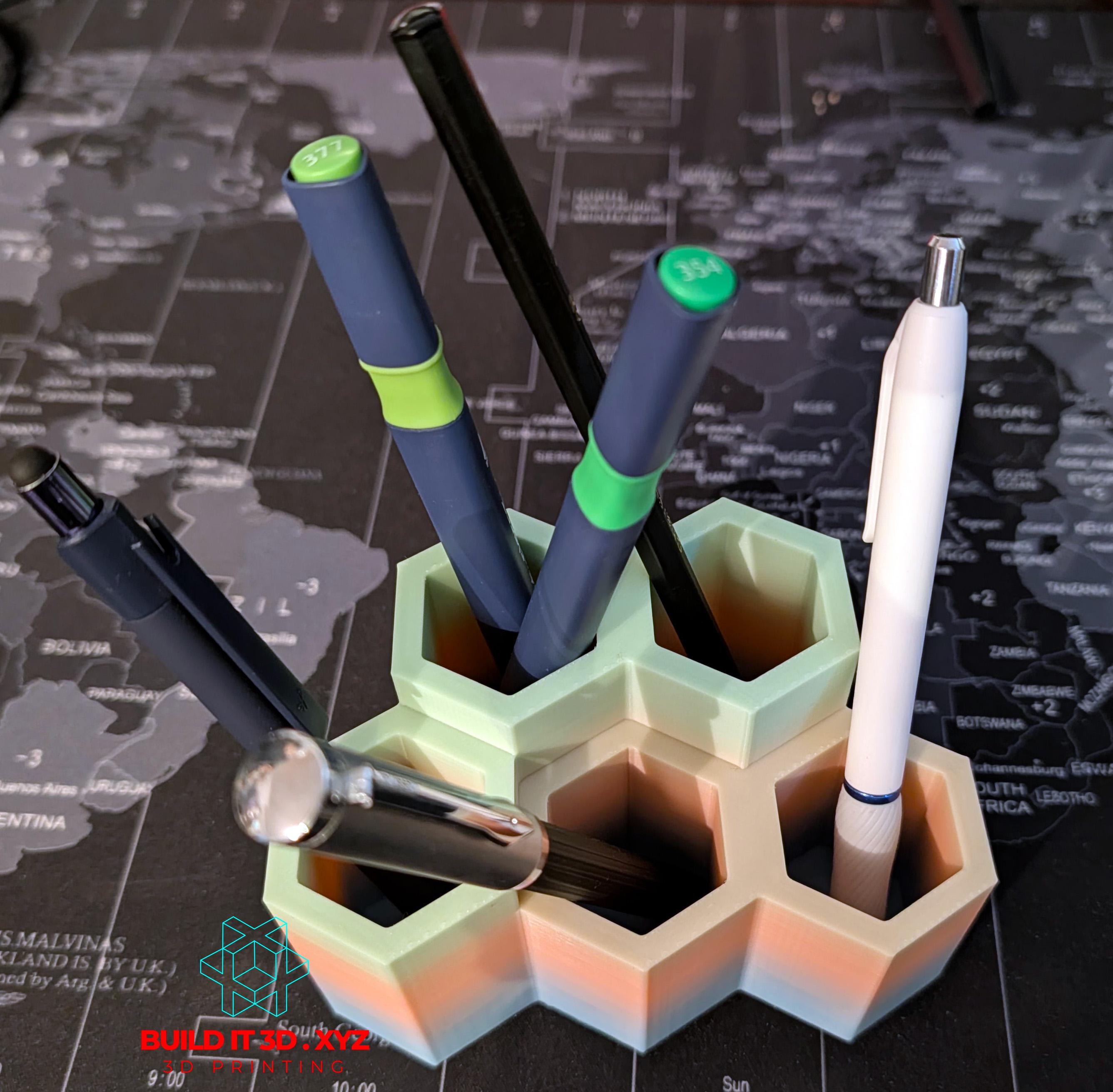 Honeycomb shaped pencil and pen desk holder. Various color options allow to pick the right choice. The holders are shaped the way that allows them to be alligned next to each other if you need to keep more pencil or pens available. Made our of PLA or PETG. Measurments: 120x80x70mm or 4.7"x3.14x2.75 Color options and materials: Rainbow - PLA Green/Blue - PLA Orange/Red - PLA Silver - PLA Gray - PETG Black - PETG Black Carbon - Carbon PETG White - PETG